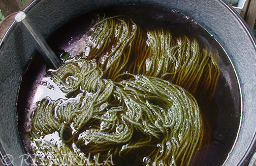 9. Samalla liemellä voit värjätä niin kauan kuin siellä näyttää olevan väriä. Mikäli liemeen on päässyt liikaa happea ja se on muuttunut siniseksi, tai lisäät liemeen langoista valunutta hapettunutta indigolientä, lisää hydrosulfiittia 10g ja lisäyksen jälkeen odota puoli tuntia, että aine ehtii vaikuttaa, ennenkuin värjäystä voi jatkaa. Usein kannattaa jatkaa värjäystä samalla liemellä seuraavana päivänä, tällöin lisää värjäystä lopettaessasi hydrosulfiittiia 10g ja peitä astia kannella. Seuraavana aamuna lämmitä liemi 45-50°C, tarkista liemen väri ja jos se on hyvä kellanvihreä, värjäystä voi jatkaa.